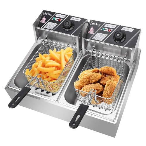 Yes, several models like the 5000W 12L dual tank deep fryer are designed with commercial kitchens in mind, offering large capacity, durable stainless steel construction, and high wattage for fast, consistent frying.