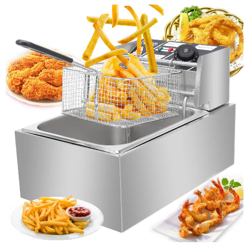 Ideal for larger batches, this deep fryer features a spacious 6.3QT capacity and efficient heating elements, ensuring consistent frying results. Its compact design makes it suitable for both home kitchens and small commercial setups.